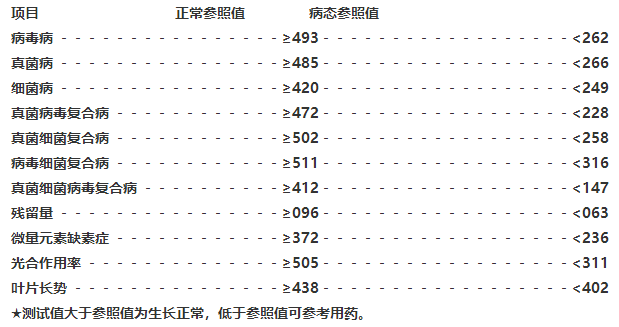 測試值為指導(dǎo)用藥參考值,測試數(shù)值越少表明作物病害越嚴(yán)重或植物長勢越弱,除用殺菌劑外應(yīng)補施葉面肥,用量不能越過某種藥品的限量值,否則產(chǎn)生藥害。