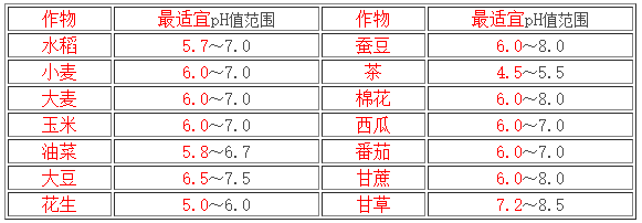 下表是一些主要農(nóng)作物適宜生長(zhǎng)的酸度范圍。土壤的酸堿度會(huì)影響作物生長(zhǎng),各種作物對(duì)土壤pH值的要求也是不同的。