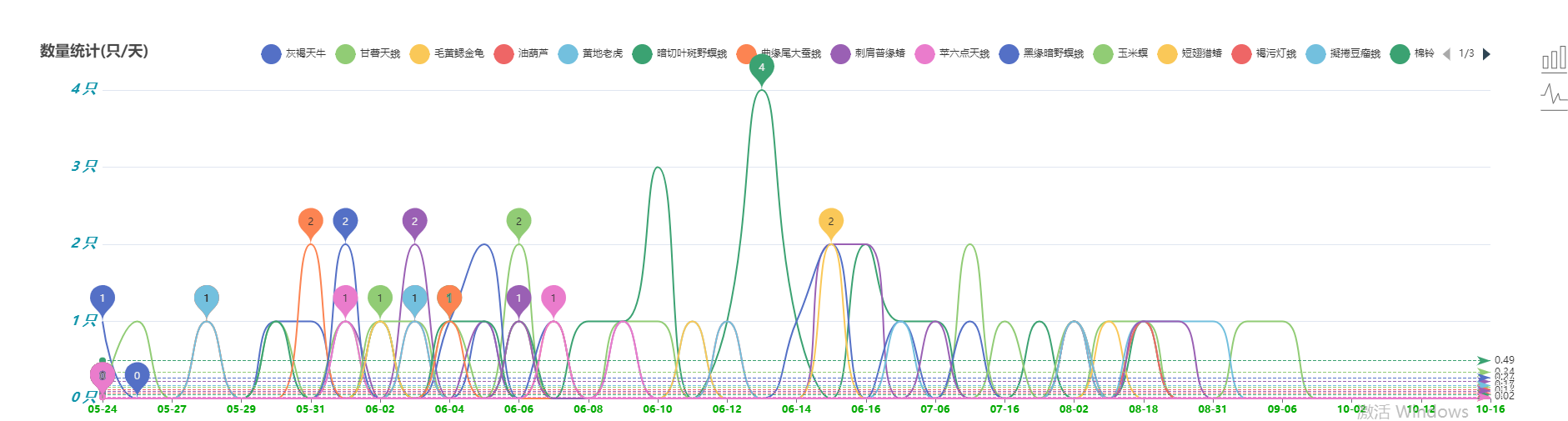 5、蟲害統(tǒng)計(jì)功能。針對(duì)不同品種害蟲識(shí)別結(jié)果歷史數(shù)據(jù),可選擇一定時(shí)間范圍內(nèi)數(shù)據(jù)查詢統(tǒng)計(jì),通過圖表形式顯示??蛇x任意害蟲種類,直觀看出發(fā)生的蟲害種類和數(shù)量,從而判斷其危害程度。