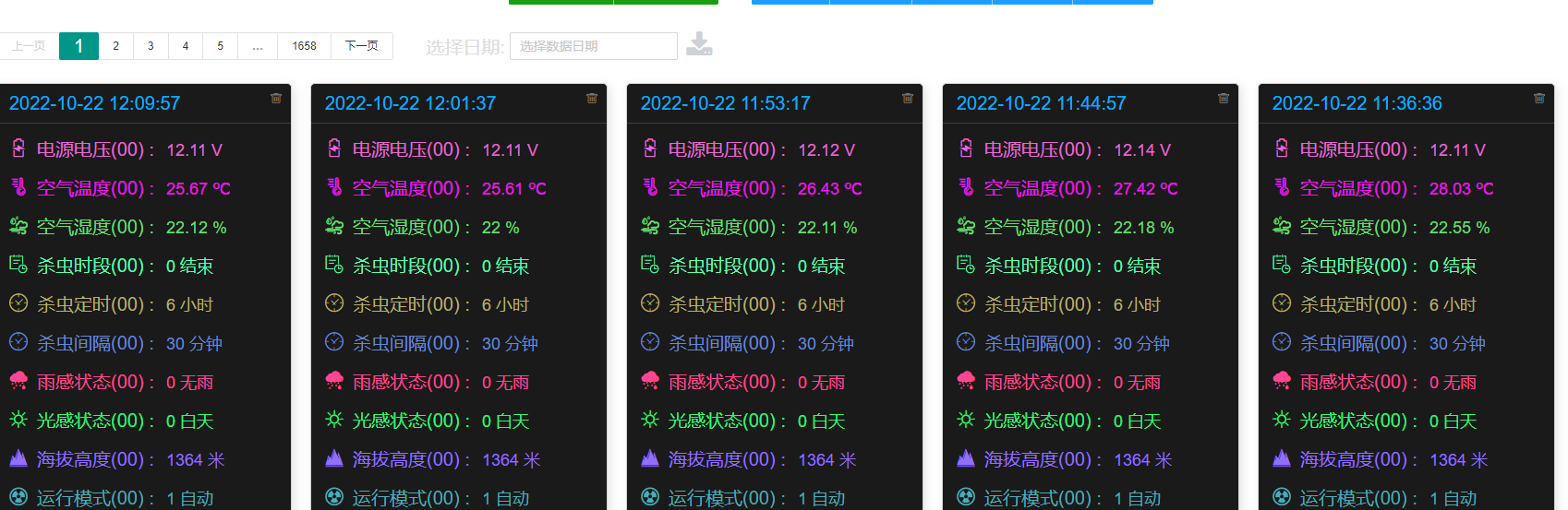 2、可實時查看設(shè)備歷史工作狀態(tài)參數(shù)數(shù)據(jù),如虧電記錄、降雨監(jiān)控、晝夜時間、環(huán)境溫濕度、經(jīng)緯度、海拔高度、運行模式、蟲體收集圖片,同時支持下載上述數(shù)據(jù)。