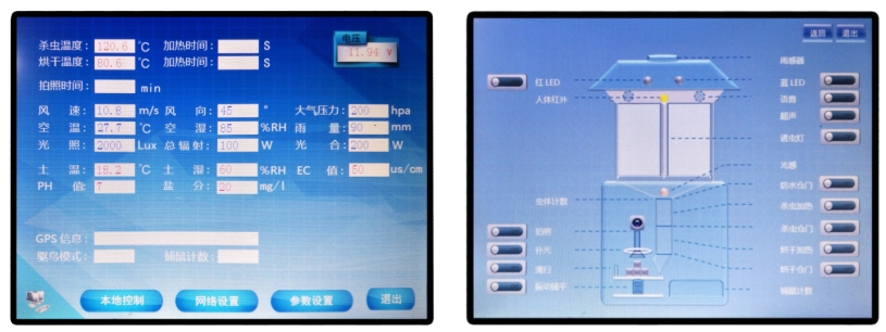 22、平臺上遠(yuǎn)程可設(shè)置數(shù)據(jù)采集間隔、攝像頭拍照打開和關(guān)閉、高壓電網(wǎng)與燈管打開等多種功能。